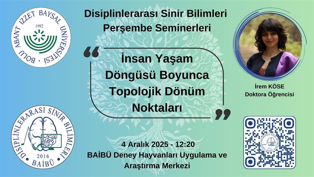 04.12.2025 tarihinde Deney Hayvanları Merkezi Seminer Salonunda Saat 12.20'de "İnsan Yaşam Döngüsü Boyunca Topolojik Dönüm Noktaları " isimli sunum olacaktır. Sunum Disiplinlerarası Sinirbilim Doktora Öğrencisi İrem KÖSE tarafından gerçekleştirilecektir.