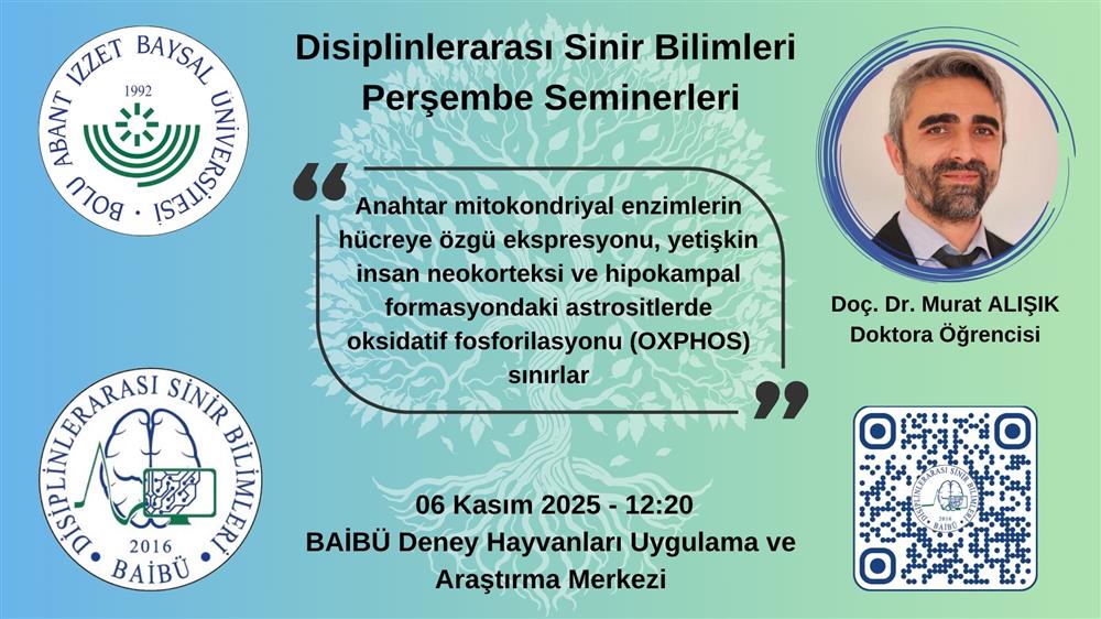 05.11.2025 tarihinde Deney Hayvanları Merkezi Seminer Salonunda Saat 12.20'de "Anahtar Mitokondriyal Enzimlerin Hücreye Özgü Eksprasyonu, Yetişkin İnsan Neokorteksi ve Hipokampal Formasyondaki Astrositlerde Oksidatif Fosforilasyon (OXPHOS) Sınırlar " isimli sunum olacaktır. Sunum Disiplinlerarası Sinirbilim Doktora Öğrencisi Doç. Dr. Murat ALIŞIK tarafından gerçekleştirilecektir.
