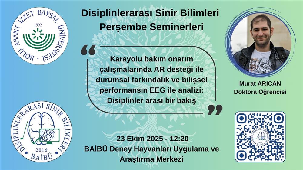 23.10.2025 tarihinde Deney Hayvanları Merkezi Seminer Salonunda saat 12:20'de ''Karayolu Bakım Onarım Çalışmalarında AR Desteğiyle Durumsal Farkındalık ve Bilişsel Performansın EEG ile Analizi:Dsiplinler Arası Bir Bakış'' isimli sunum olacaktır. Sunum Disiplinlerarası Sinirbilim Doktora Öğrencisi Murat ARICAN tarafından gerçekleştirilecektir.