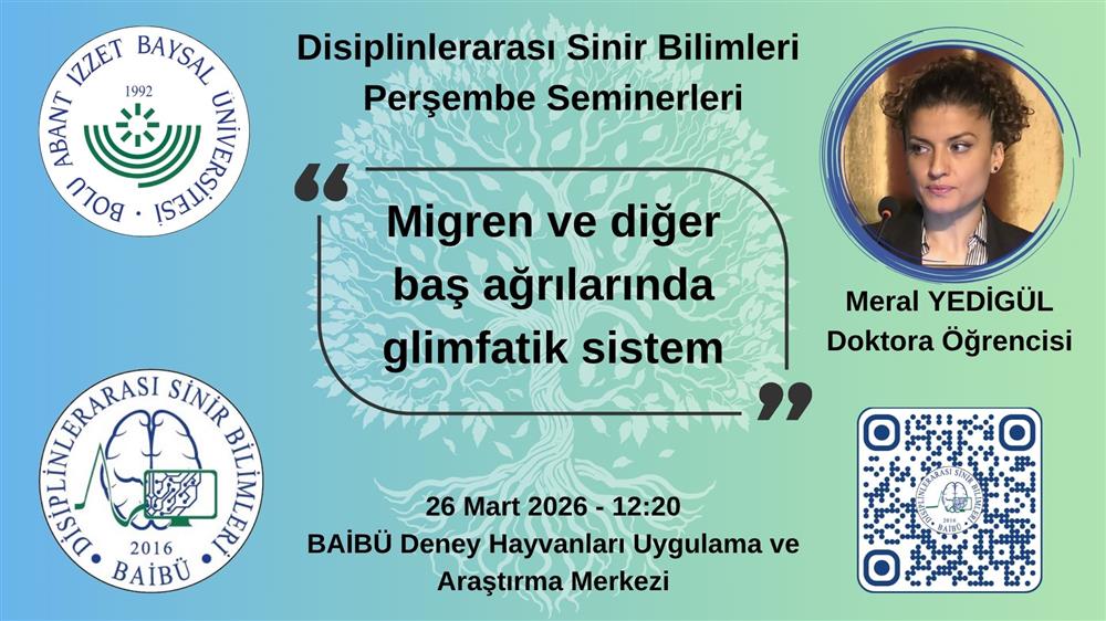 26.03.2026 tarihinde Deney Hayvanları Merkezi Seminer Salonunda Saat 12.20'de "Migren ve Diğer Baş Ağrılarında Glimfatik Sistem " isimli sunum olacaktır. Sunum Disiplinlerarası Sinirbilim Doktora Öğrencisi Meral YEDİGÜL tarafından gerçekleştirilecektir.
