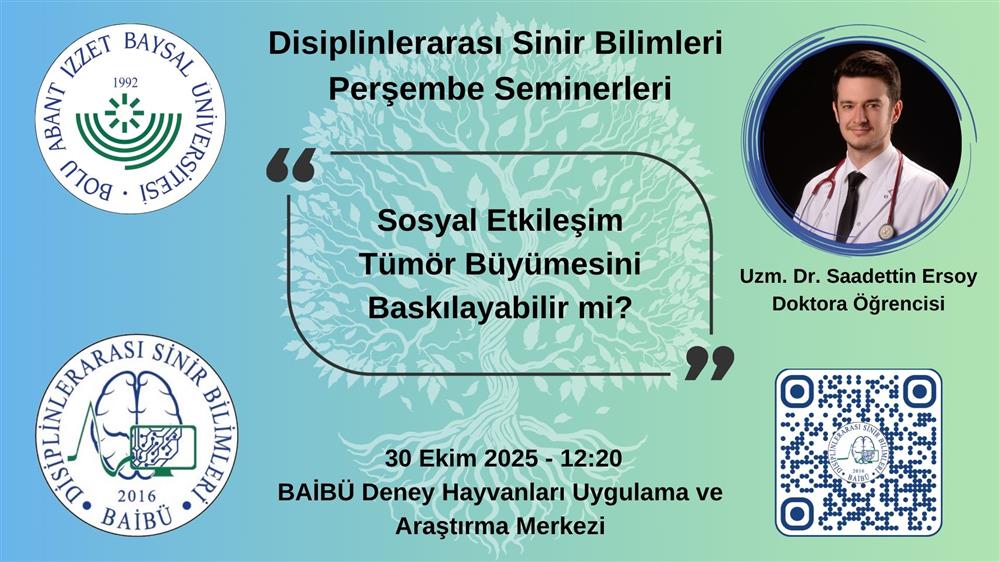 30.10.2025 tarihinde Deney Hayvanları Merkezi Seminer Salonunda Saat 12.20'de "Sosyal Etkileşim Tümör Büyümesini Baskılayabilir mi? " isimli sunum olacaktır. Sunum Disiplinlerarası Sinirbilim Doktora Öğrencisi Uzm. Dr. Saadettin ERSOY tarafından gerçekleştirilecektir.